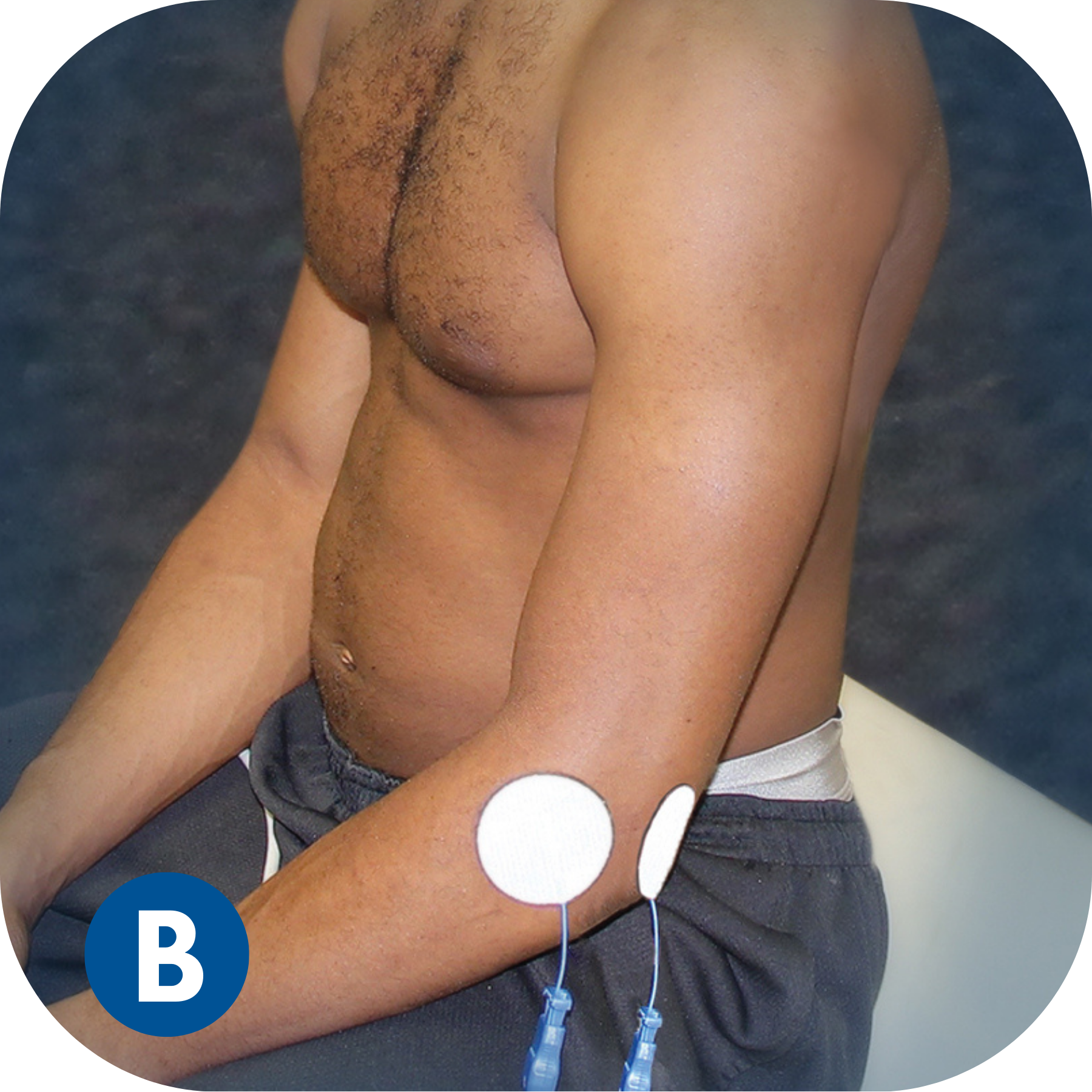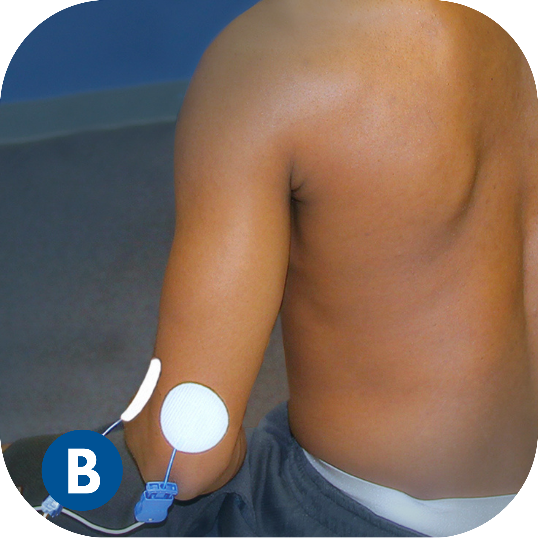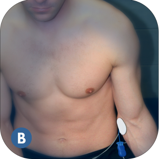 Do NOT place electrodes over the heart, or across the thoracic volume. Electrodes can be applied to the back of the thorax and lateral aspect of the upper limb (i.e. below/down the shoulder).