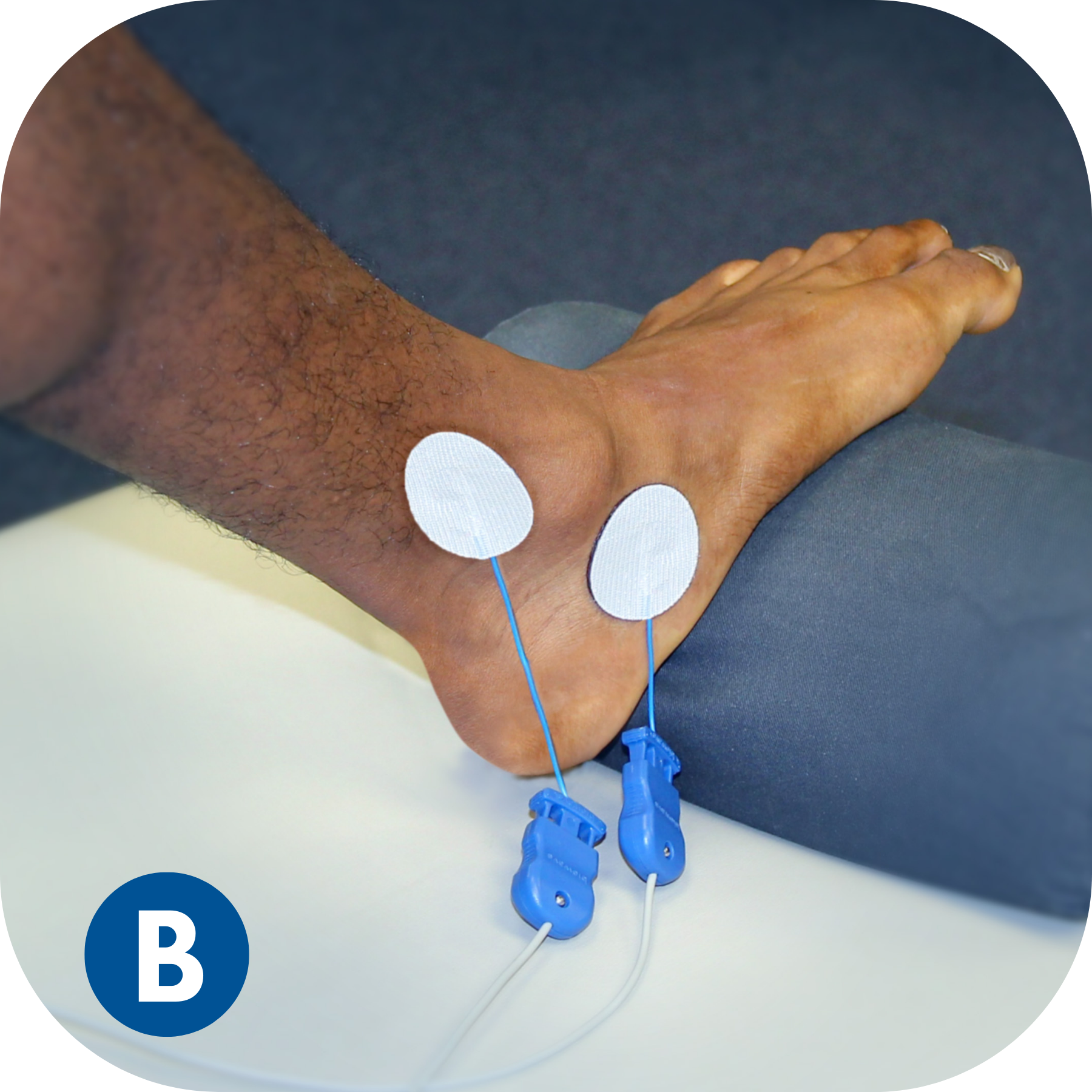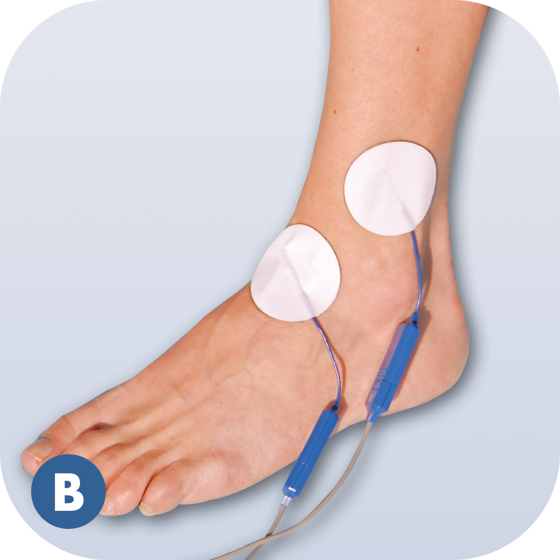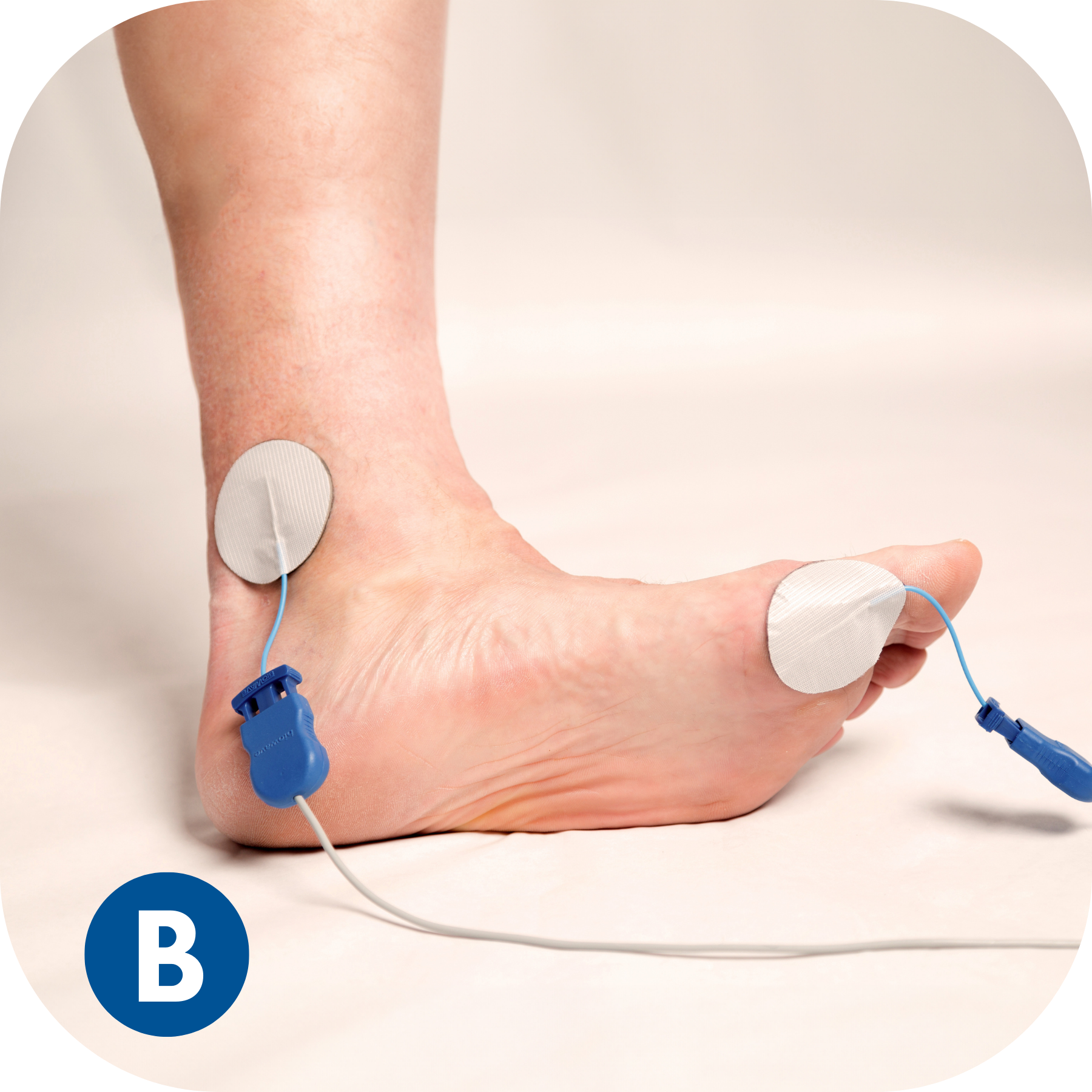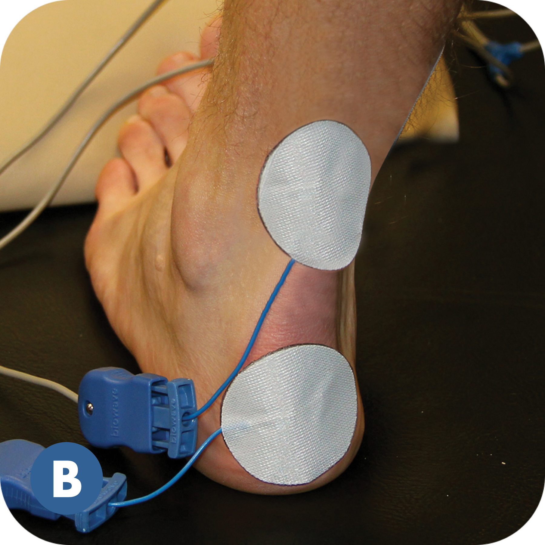 BioWaveGO electrode placements are different from conventional electrical stimulation. The mixing of the patented therapeutic signals occurs in a 3.5-inch hemishpere, not along the surface of the skin between the electrodes. As a result, electrodes need to be placed directly over locations of pain, or one electrode over a single location of pain and a second over a comfortable location to recieve stimulation – typically over a bony prominence near the treatment site.