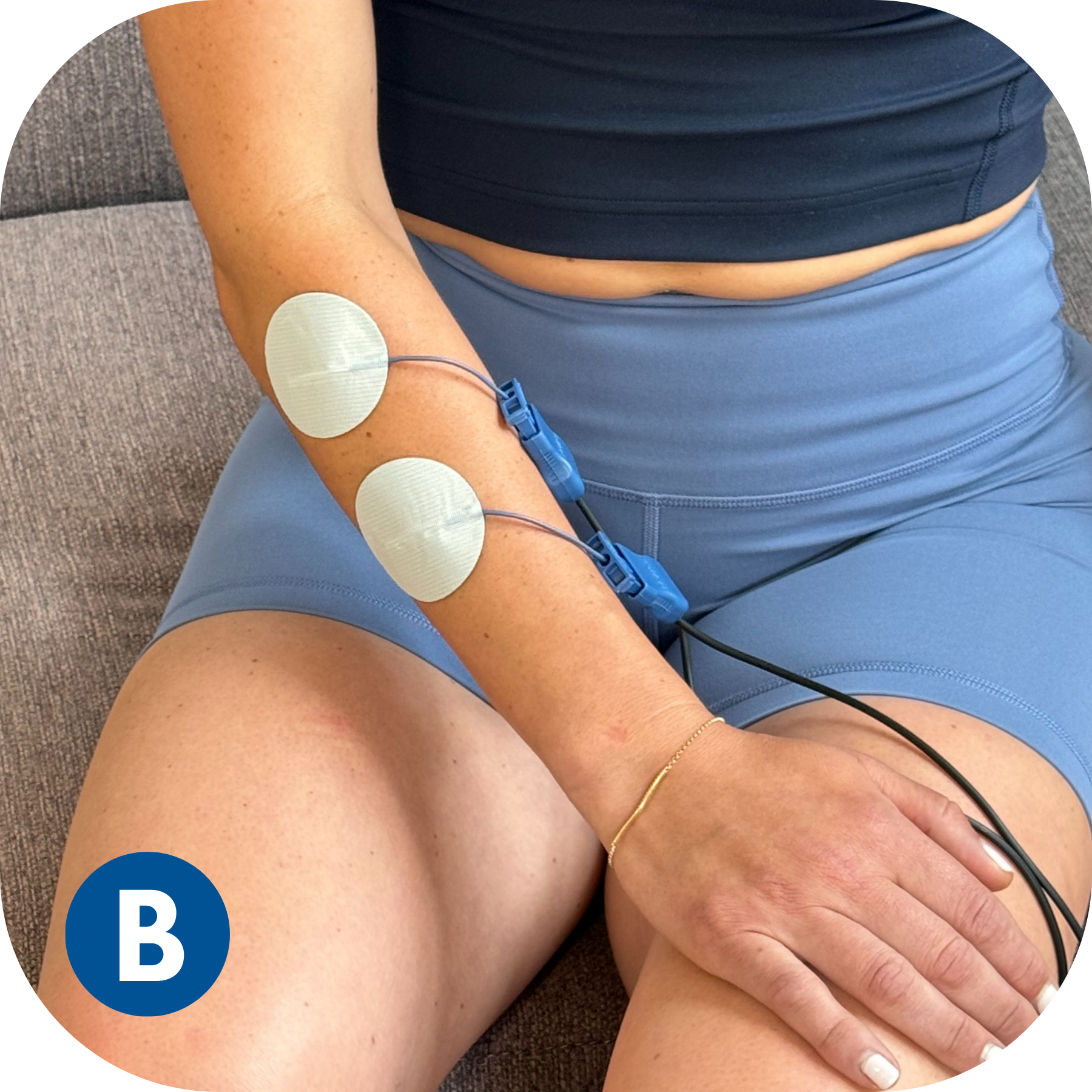 BioWaveGO electrode placements are different from conventional electrical stimulation. The mixing of the patented therapeutic signals occurs in a 3.5-inch hemishpere, not along the surface of the skin between the electrodes. As a result, electrodes need to be placed directly over locations of pain, or one electrode over a single location of pain and a second over a comfortable location to recieve stimulation – typically over a bony prominence near the treatment site.