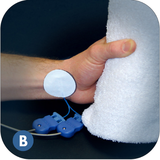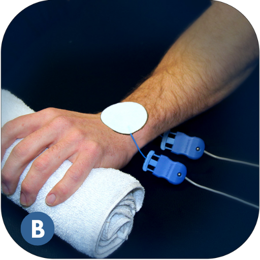 Do NOT place electrodes over the heart, or across the thoracic volume. Electrodes can be applied to the back of the thorax and lateral aspect of the upper limb (i.e. below/down the shoulder).