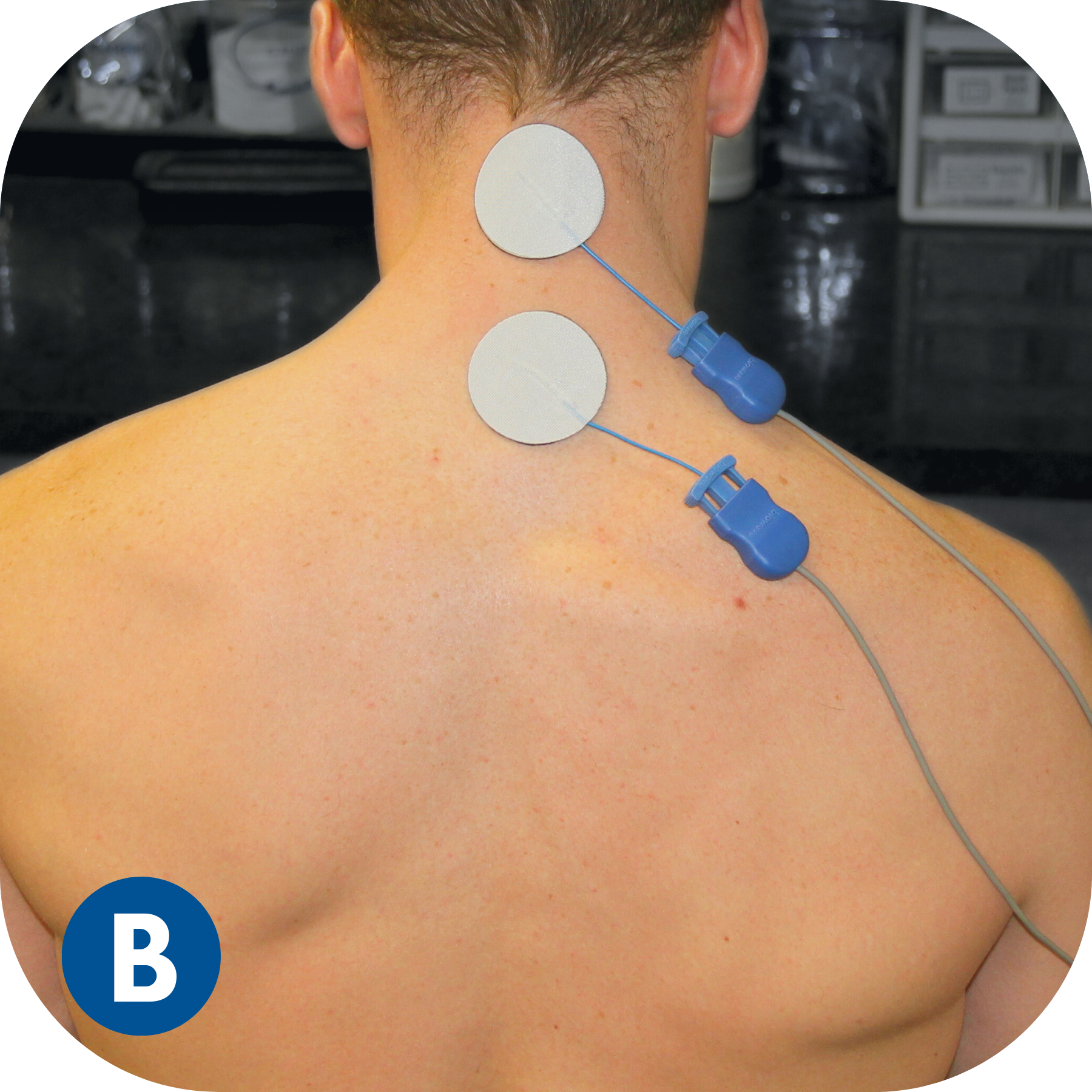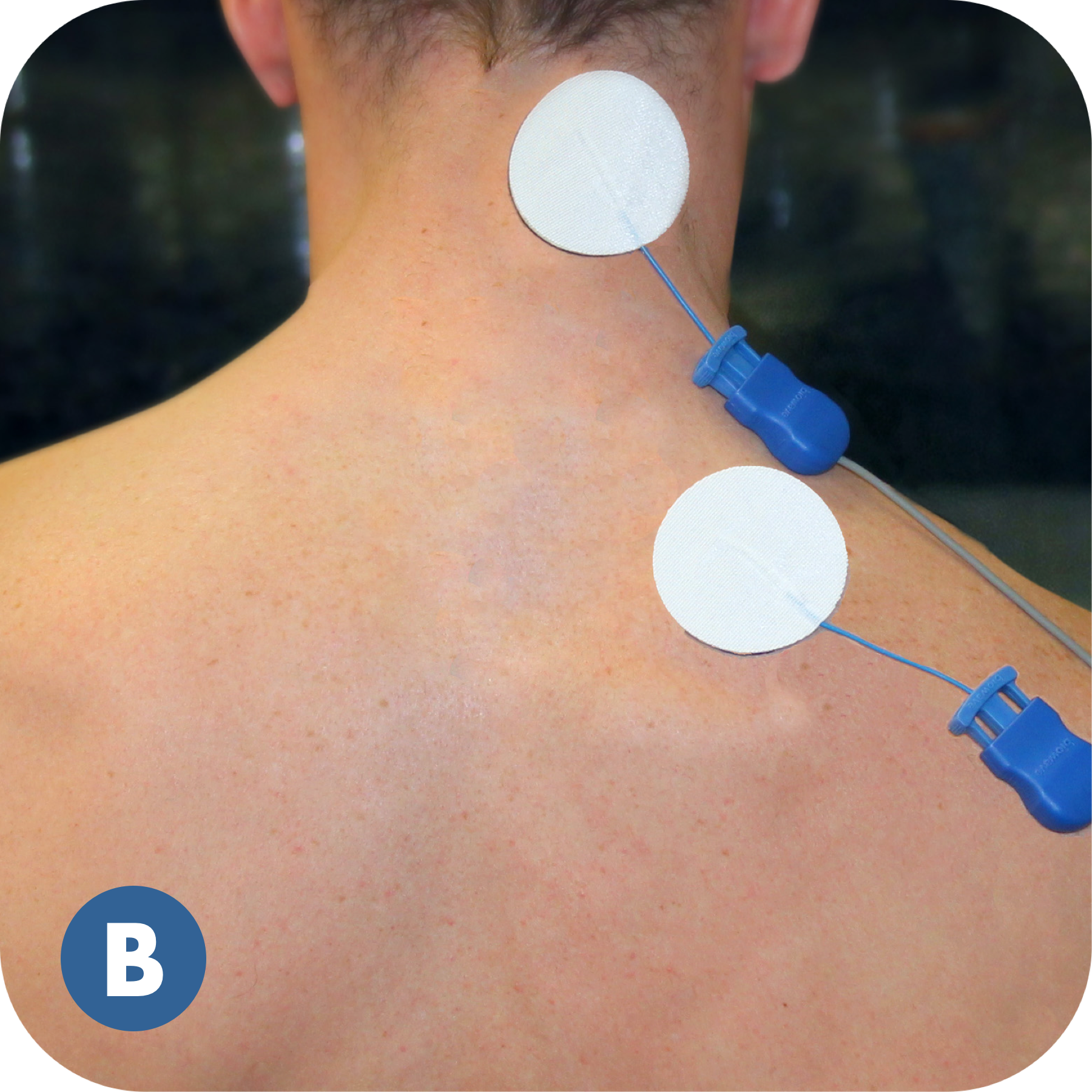 Do NOT place electrodes over the heart, or across the thoracic volume. Electrodes can be applied to the back of the thorax and lateral aspect of the upper limb (i.e. below/down the shoulder).