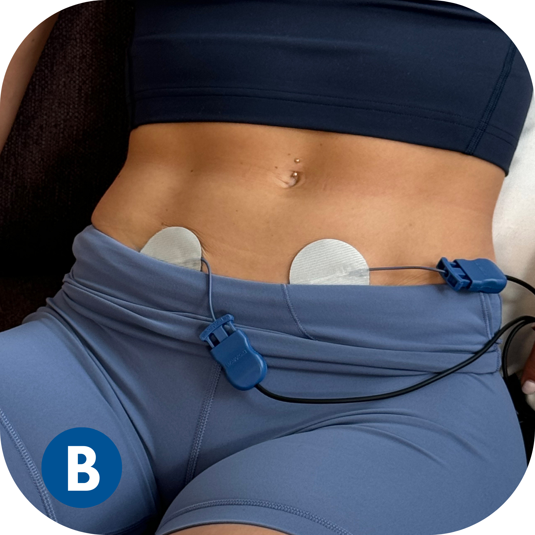 BioWaveGO electrode placements are different from conventional electrical stimulation. The mixing of the patented therapeutic signals occurs in a 3.5-inch hemishpere, not along the surface of the skin between the electrodes. As a result, electrodes need to be placed directly over locations of pain, or one electrode over a single location of pain and a second over a comfortable location to recieve stimulation – typically over a bony prominence near the treatment site.