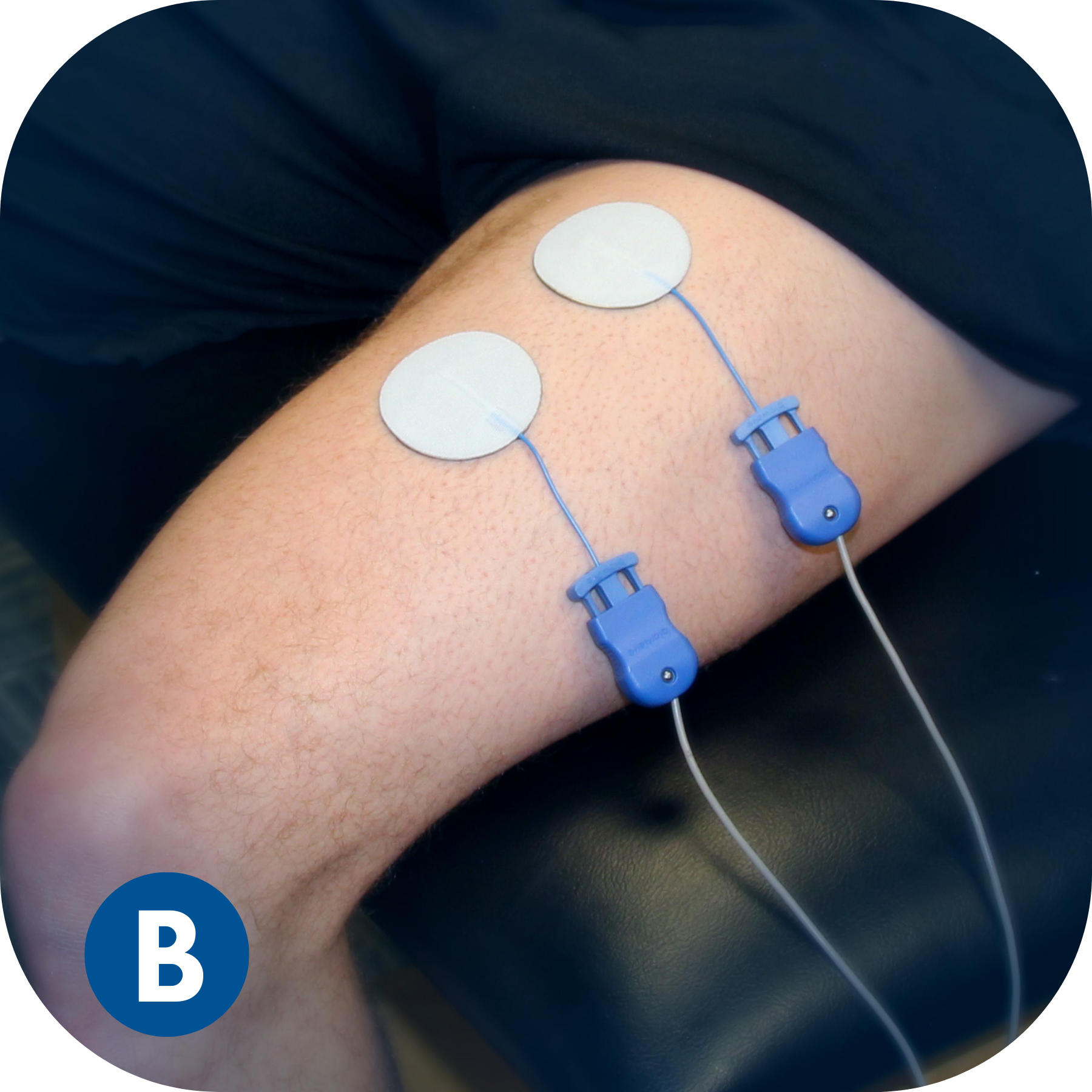 BioWaveGO electrode placements are different from conventional electrical stimulation. The mixing of the patented therapeutic signals occurs in a 3.5-inch hemishpere, not along the surface of the skin between the electrodes. As a result, electrodes need to be placed directly over locations of pain, or one electrode over a single location of pain and a second over a comfortable location to recieve stimulation – typically over a bony prominence near the treatment site.