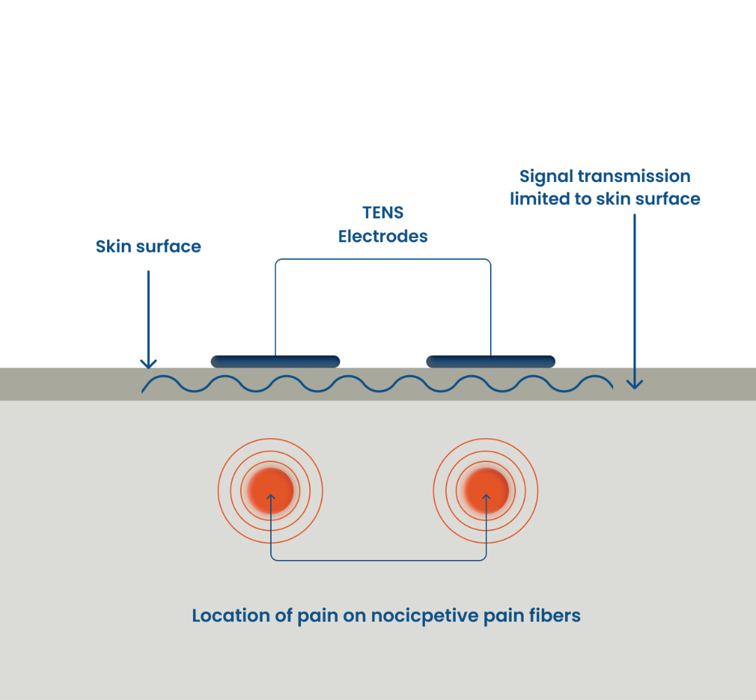 Low frequency signals (1-180Hz in frequency) are required to inhibit transmission of pain signals along nerve fibers in the body. However, electrical signals in this frequency range cannot pass through the skin because of the skin’s impedance and capacitance. TENS devices deliver pulsed low-frequency signals across the surface of skin typically between two surface electrodes placed on either side of the painful area. The result is a surface effect based on Gate Control Theory and the patient feels a noxious twitching, electrical sensation between the electrodes. The sensation produced by TENS may act as a distraction from the pain while the device is on, however, there is little residual benefit or functional improvement once the therapy session is over.